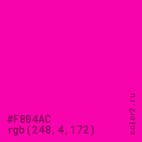 Цвет #F804AC в цветовой модели RGB обозначается тремя октетами (248, 4, 172) в десятичном формате и #F804AC в шестнадцатиричном (hex) формате, которые являются интенсивностью красного 248 (hex F8), интенсивность зелёного 4 (hex 04) и интенсивность синего 172 (hex AC).