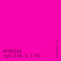 Цвет #F805AE в цветовой модели RGB обозначается тремя октетами (248, 5, 174) в десятичном формате и #F805AE в шестнадцатиричном (hex) формате, которые являются интенсивностью красного 248 (hex F8), интенсивность зелёного 5 (hex 05) и интенсивность синего 174 (hex AE).