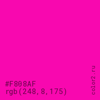 Цвет #F808AF в цветовой модели RGB обозначается тремя октетами (248, 8, 175) в десятичном формате и #F808AF в шестнадцатиричном (hex) формате, которые являются интенсивностью красного 248 (hex F8), интенсивность зелёного 8 (hex 08) и интенсивность синего 175 (hex AF).