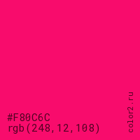 Цвет #F80C6C в цветовой модели RGB обозначается тремя октетами (248, 12, 108) в десятичном формате и #F80C6C в шестнадцатиричном (hex) формате, которые являются интенсивностью красного 248 (hex F8), интенсивность зелёного 12 (hex 0C) и интенсивность синего 108 (hex 6C).