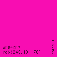 Цвет #F80DB2 в цветовой модели RGB обозначается тремя октетами (248, 13, 178) в десятичном формате и #F80DB2 в шестнадцатиричном (hex) формате, которые являются интенсивностью красного 248 (hex F8), интенсивность зелёного 13 (hex 0D) и интенсивность синего 178 (hex B2).