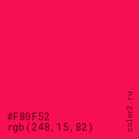 Цвет #F80F52 в цветовой модели RGB обозначается тремя октетами (248, 15, 82) в десятичном формате и #F80F52 в шестнадцатиричном (hex) формате, которые являются интенсивностью красного 248 (hex F8), интенсивность зелёного 15 (hex 0F) и интенсивность синего 82 (hex 52).