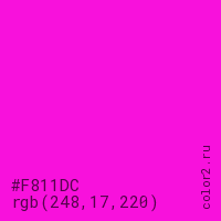 Цвет #F811DC в цветовой модели RGB обозначается тремя октетами (248, 17, 220) в десятичном формате и #F811DC в шестнадцатиричном (hex) формате, которые являются интенсивностью красного 248 (hex F8), интенсивность зелёного 17 (hex 11) и интенсивность синего 220 (hex DC).
