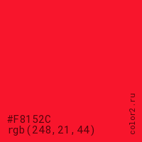 Цвет #F8152C в цветовой модели RGB обозначается тремя октетами (248, 21, 44) в десятичном формате и #F8152C в шестнадцатиричном (hex) формате, которые являются интенсивностью красного 248 (hex F8), интенсивность зелёного 21 (hex 15) и интенсивность синего 44 (hex 2C).