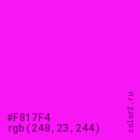 Цвет #F817F4 в цветовой модели RGB обозначается тремя октетами (248, 23, 244) в десятичном формате и #F817F4 в шестнадцатиричном (hex) формате, которые являются интенсивностью красного 248 (hex F8), интенсивность зелёного 23 (hex 17) и интенсивность синего 244 (hex F4).