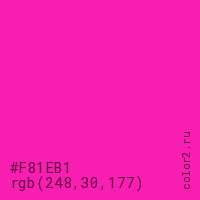 Цвет #F81EB1 в цветовой модели RGB обозначается тремя октетами (248, 30, 177) в десятичном формате и #F81EB1 в шестнадцатиричном (hex) формате, которые являются интенсивностью красного 248 (hex F8), интенсивность зелёного 30 (hex 1E) и интенсивность синего 177 (hex B1).