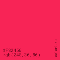 Цвет #F82456 в цветовой модели RGB обозначается тремя октетами (248, 36, 86) в десятичном формате и #F82456 в шестнадцатиричном (hex) формате, которые являются интенсивностью красного 248 (hex F8), интенсивность зелёного 36 (hex 24) и интенсивность синего 86 (hex 56).