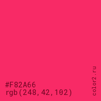 Цвет #F82A66 в цветовой модели RGB обозначается тремя октетами (248, 42, 102) в десятичном формате и #F82A66 в шестнадцатиричном (hex) формате, которые являются интенсивностью красного 248 (hex F8), интенсивность зелёного 42 (hex 2A) и интенсивность синего 102 (hex 66).