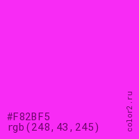 Цвет #F82BF5 в цветовой модели RGB обозначается тремя октетами (248, 43, 245) в десятичном формате и #F82BF5 в шестнадцатиричном (hex) формате, которые являются интенсивностью красного 248 (hex F8), интенсивность зелёного 43 (hex 2B) и интенсивность синего 245 (hex F5).