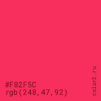 Цвет #F82F5C в цветовой модели RGB обозначается тремя октетами (248, 47, 92) в десятичном формате и #F82F5C в шестнадцатиричном (hex) формате, которые являются интенсивностью красного 248 (hex F8), интенсивность зелёного 47 (hex 2F) и интенсивность синего 92 (hex 5C).
