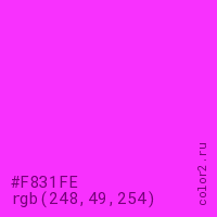 Цвет #F831FE в цветовой модели RGB обозначается тремя октетами (248, 49, 254) в десятичном формате и #F831FE в шестнадцатиричном (hex) формате, которые являются интенсивностью красного 248 (hex F8), интенсивность зелёного 49 (hex 31) и интенсивность синего 254 (hex FE).