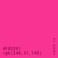 Цвет #F83391 в цветовой модели RGB обозначается тремя октетами (248, 51, 145) в десятичном формате и #F83391 в шестнадцатиричном (hex) формате, которые являются интенсивностью красного 248 (hex F8), интенсивность зелёного 51 (hex 33) и интенсивность синего 145 (hex 91).