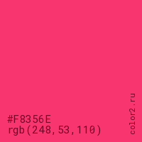 Цвет #F8356E в цветовой модели RGB обозначается тремя октетами (248, 53, 110) в десятичном формате и #F8356E в шестнадцатиричном (hex) формате, которые являются интенсивностью красного 248 (hex F8), интенсивность зелёного 53 (hex 35) и интенсивность синего 110 (hex 6E).