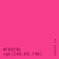 Цвет #F83C8C в цветовой модели RGB обозначается тремя октетами (248, 60, 140) в десятичном формате и #F83C8C в шестнадцатиричном (hex) формате, которые являются интенсивностью красного 248 (hex F8), интенсивность зелёного 60 (hex 3C) и интенсивность синего 140 (hex 8C).