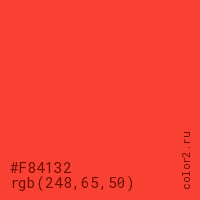Цвет #F84132 в цветовой модели RGB обозначается тремя октетами (248, 65, 50) в десятичном формате и #F84132 в шестнадцатиричном (hex) формате, которые являются интенсивностью красного 248 (hex F8), интенсивность зелёного 65 (hex 41) и интенсивность синего 50 (hex 32).
