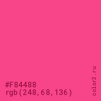 Цвет #F84488 в цветовой модели RGB обозначается тремя октетами (248, 68, 136) в десятичном формате и #F84488 в шестнадцатиричном (hex) формате, которые являются интенсивностью красного 248 (hex F8), интенсивность зелёного 68 (hex 44) и интенсивность синего 136 (hex 88).