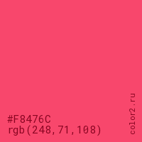 Цвет #F8476C в цветовой модели RGB обозначается тремя октетами (248, 71, 108) в десятичном формате и #F8476C в шестнадцатиричном (hex) формате, которые являются интенсивностью красного 248 (hex F8), интенсивность зелёного 71 (hex 47) и интенсивность синего 108 (hex 6C).