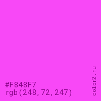 Цвет #F848F7 в цветовой модели RGB обозначается тремя октетами (248, 72, 247) в десятичном формате и #F848F7 в шестнадцатиричном (hex) формате, которые являются интенсивностью красного 248 (hex F8), интенсивность зелёного 72 (hex 48) и интенсивность синего 247 (hex F7).