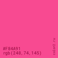Цвет #F84A91 в цветовой модели RGB обозначается тремя октетами (248, 74, 145) в десятичном формате и #F84A91 в шестнадцатиричном (hex) формате, которые являются интенсивностью красного 248 (hex F8), интенсивность зелёного 74 (hex 4A) и интенсивность синего 145 (hex 91).