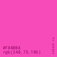Цвет #F84BBA в цветовой модели RGB обозначается тремя октетами (248, 75, 186) в десятичном формате и #F84BBA в шестнадцатиричном (hex) формате, которые являются интенсивностью красного 248 (hex F8), интенсивность зелёного 75 (hex 4B) и интенсивность синего 186 (hex BA).