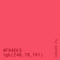 Цвет #F84E65 в цветовой модели RGB обозначается тремя октетами (248, 78, 101) в десятичном формате и #F84E65 в шестнадцатиричном (hex) формате, которые являются интенсивностью красного 248 (hex F8), интенсивность зелёного 78 (hex 4E) и интенсивность синего 101 (hex 65).