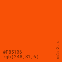 Цвет #F85106 в цветовой модели RGB обозначается тремя октетами (248, 81, 6) в десятичном формате и #F85106 в шестнадцатиричном (hex) формате, которые являются интенсивностью красного 248 (hex F8), интенсивность зелёного 81 (hex 51) и интенсивность синего 6 (hex 06).