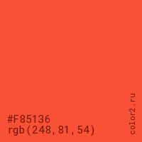 Цвет #F85136 в цветовой модели RGB обозначается тремя октетами (248, 81, 54) в десятичном формате и #F85136 в шестнадцатиричном (hex) формате, которые являются интенсивностью красного 248 (hex F8), интенсивность зелёного 81 (hex 51) и интенсивность синего 54 (hex 36).