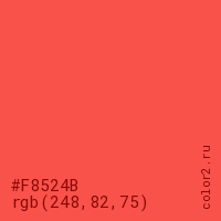 Цвет #F8524B в цветовой модели RGB обозначается тремя октетами (248, 82, 75) в десятичном формате и #F8524B в шестнадцатиричном (hex) формате, которые являются интенсивностью красного 248 (hex F8), интенсивность зелёного 82 (hex 52) и интенсивность синего 75 (hex 4B).