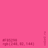 Цвет #F85290 в цветовой модели RGB обозначается тремя октетами (248, 82, 144) в десятичном формате и #F85290 в шестнадцатиричном (hex) формате, которые являются интенсивностью красного 248 (hex F8), интенсивность зелёного 82 (hex 52) и интенсивность синего 144 (hex 90).