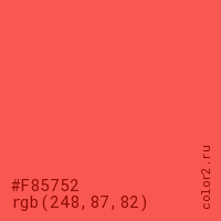 Цвет #F85752 в цветовой модели RGB обозначается тремя октетами (248, 87, 82) в десятичном формате и #F85752 в шестнадцатиричном (hex) формате, которые являются интенсивностью красного 248 (hex F8), интенсивность зелёного 87 (hex 57) и интенсивность синего 82 (hex 52).