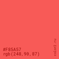 Цвет #F85A57 в цветовой модели RGB обозначается тремя октетами (248, 90, 87) в десятичном формате и #F85A57 в шестнадцатиричном (hex) формате, которые являются интенсивностью красного 248 (hex F8), интенсивность зелёного 90 (hex 5A) и интенсивность синего 87 (hex 57).