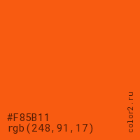 Цвет #F85B11 в цветовой модели RGB обозначается тремя октетами (248, 91, 17) в десятичном формате и #F85B11 в шестнадцатиричном (hex) формате, которые являются интенсивностью красного 248 (hex F8), интенсивность зелёного 91 (hex 5B) и интенсивность синего 17 (hex 11).