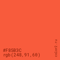 Цвет #F85B3C в цветовой модели RGB обозначается тремя октетами (248, 91, 60) в десятичном формате и #F85B3C в шестнадцатиричном (hex) формате, которые являются интенсивностью красного 248 (hex F8), интенсивность зелёного 91 (hex 5B) и интенсивность синего 60 (hex 3C).