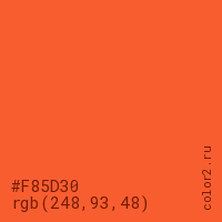 Цвет #F85D30 в цветовой модели RGB обозначается тремя октетами (248, 93, 48) в десятичном формате и #F85D30 в шестнадцатиричном (hex) формате, которые являются интенсивностью красного 248 (hex F8), интенсивность зелёного 93 (hex 5D) и интенсивность синего 48 (hex 30).