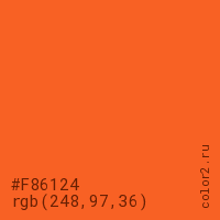 Цвет #F86124 в цветовой модели RGB обозначается тремя октетами (248, 97, 36) в десятичном формате и #F86124 в шестнадцатиричном (hex) формате, которые являются интенсивностью красного 248 (hex F8), интенсивность зелёного 97 (hex 61) и интенсивность синего 36 (hex 24).