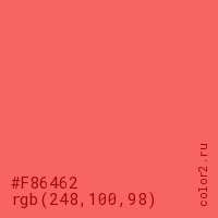 Цвет #F86462 в цветовой модели RGB обозначается тремя октетами (248, 100, 98) в десятичном формате и #F86462 в шестнадцатиричном (hex) формате, которые являются интенсивностью красного 248 (hex F8), интенсивность зелёного 100 (hex 64) и интенсивность синего 98 (hex 62).