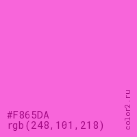 Цвет #F865DA в цветовой модели RGB обозначается тремя октетами (248, 101, 218) в десятичном формате и #F865DA в шестнадцатиричном (hex) формате, которые являются интенсивностью красного 248 (hex F8), интенсивность зелёного 101 (hex 65) и интенсивность синего 218 (hex DA).