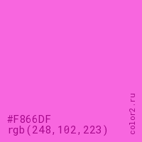 Цвет #F866DF в цветовой модели RGB обозначается тремя октетами (248, 102, 223) в десятичном формате и #F866DF в шестнадцатиричном (hex) формате, которые являются интенсивностью красного 248 (hex F8), интенсивность зелёного 102 (hex 66) и интенсивность синего 223 (hex DF).