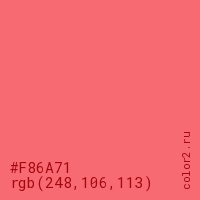 Цвет #F86A71 в цветовой модели RGB обозначается тремя октетами (248, 106, 113) в десятичном формате и #F86A71 в шестнадцатиричном (hex) формате, которые являются интенсивностью красного 248 (hex F8), интенсивность зелёного 106 (hex 6A) и интенсивность синего 113 (hex 71).