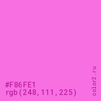 Цвет #F86FE1 в цветовой модели RGB обозначается тремя октетами (248, 111, 225) в десятичном формате и #F86FE1 в шестнадцатиричном (hex) формате, которые являются интенсивностью красного 248 (hex F8), интенсивность зелёного 111 (hex 6F) и интенсивность синего 225 (hex E1).