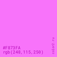 Цвет #F873FA в цветовой модели RGB обозначается тремя октетами (248, 115, 250) в десятичном формате и #F873FA в шестнадцатиричном (hex) формате, которые являются интенсивностью красного 248 (hex F8), интенсивность зелёного 115 (hex 73) и интенсивность синего 250 (hex FA).