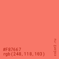 Цвет #F87667 в цветовой модели RGB обозначается тремя октетами (248, 118, 103) в десятичном формате и #F87667 в шестнадцатиричном (hex) формате, которые являются интенсивностью красного 248 (hex F8), интенсивность зелёного 118 (hex 76) и интенсивность синего 103 (hex 67).
