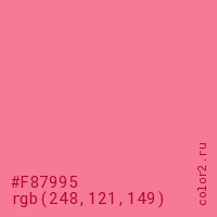 Цвет #F87995 в цветовой модели RGB обозначается тремя октетами (248, 121, 149) в десятичном формате и #F87995 в шестнадцатиричном (hex) формате, которые являются интенсивностью красного 248 (hex F8), интенсивность зелёного 121 (hex 79) и интенсивность синего 149 (hex 95).
