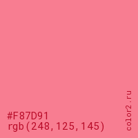 Цвет #F87D91 в цветовой модели RGB обозначается тремя октетами (248, 125, 145) в десятичном формате и #F87D91 в шестнадцатиричном (hex) формате, которые являются интенсивностью красного 248 (hex F8), интенсивность зелёного 125 (hex 7D) и интенсивность синего 145 (hex 91).