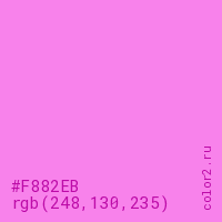 Цвет #F882EB в цветовой модели RGB обозначается тремя октетами (248, 130, 235) в десятичном формате и #F882EB в шестнадцатиричном (hex) формате, которые являются интенсивностью красного 248 (hex F8), интенсивность зелёного 130 (hex 82) и интенсивность синего 235 (hex EB).