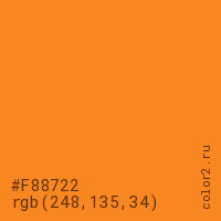 Цвет #F88722 в цветовой модели RGB обозначается тремя октетами (248, 135, 34) в десятичном формате и #F88722 в шестнадцатиричном (hex) формате, которые являются интенсивностью красного 248 (hex F8), интенсивность зелёного 135 (hex 87) и интенсивность синего 34 (hex 22).