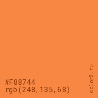 Цвет #F88744 в цветовой модели RGB обозначается тремя октетами (248, 135, 68) в десятичном формате и #F88744 в шестнадцатиричном (hex) формате, которые являются интенсивностью красного 248 (hex F8), интенсивность зелёного 135 (hex 87) и интенсивность синего 68 (hex 44).