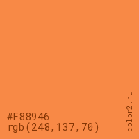 Цвет #F88946 в цветовой модели RGB обозначается тремя октетами (248, 137, 70) в десятичном формате и #F88946 в шестнадцатиричном (hex) формате, которые являются интенсивностью красного 248 (hex F8), интенсивность зелёного 137 (hex 89) и интенсивность синего 70 (hex 46).