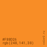 Цвет #F88D26 в цветовой модели RGB обозначается тремя октетами (248, 141, 38) в десятичном формате и #F88D26 в шестнадцатиричном (hex) формате, которые являются интенсивностью красного 248 (hex F8), интенсивность зелёного 141 (hex 8D) и интенсивность синего 38 (hex 26).