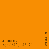 Цвет #F88E02 в цветовой модели RGB обозначается тремя октетами (248, 142, 2) в десятичном формате и #F88E02 в шестнадцатиричном (hex) формате, которые являются интенсивностью красного 248 (hex F8), интенсивность зелёного 142 (hex 8E) и интенсивность синего 2 (hex 02).